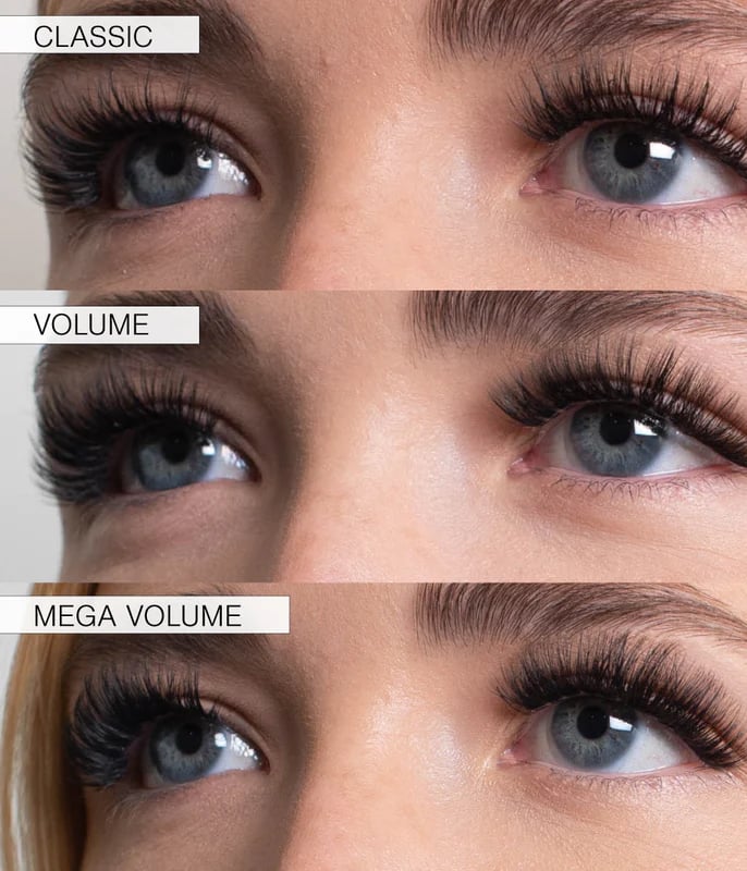 What are volume eyelash extensions? Volume eyelash extensions are where two or more individual extensions are attached to each natural lash. They are first formed into fans, which is where the desired number of lashes are fanned out and as a “bouquet”, applied onto one natural lash with adhesive.